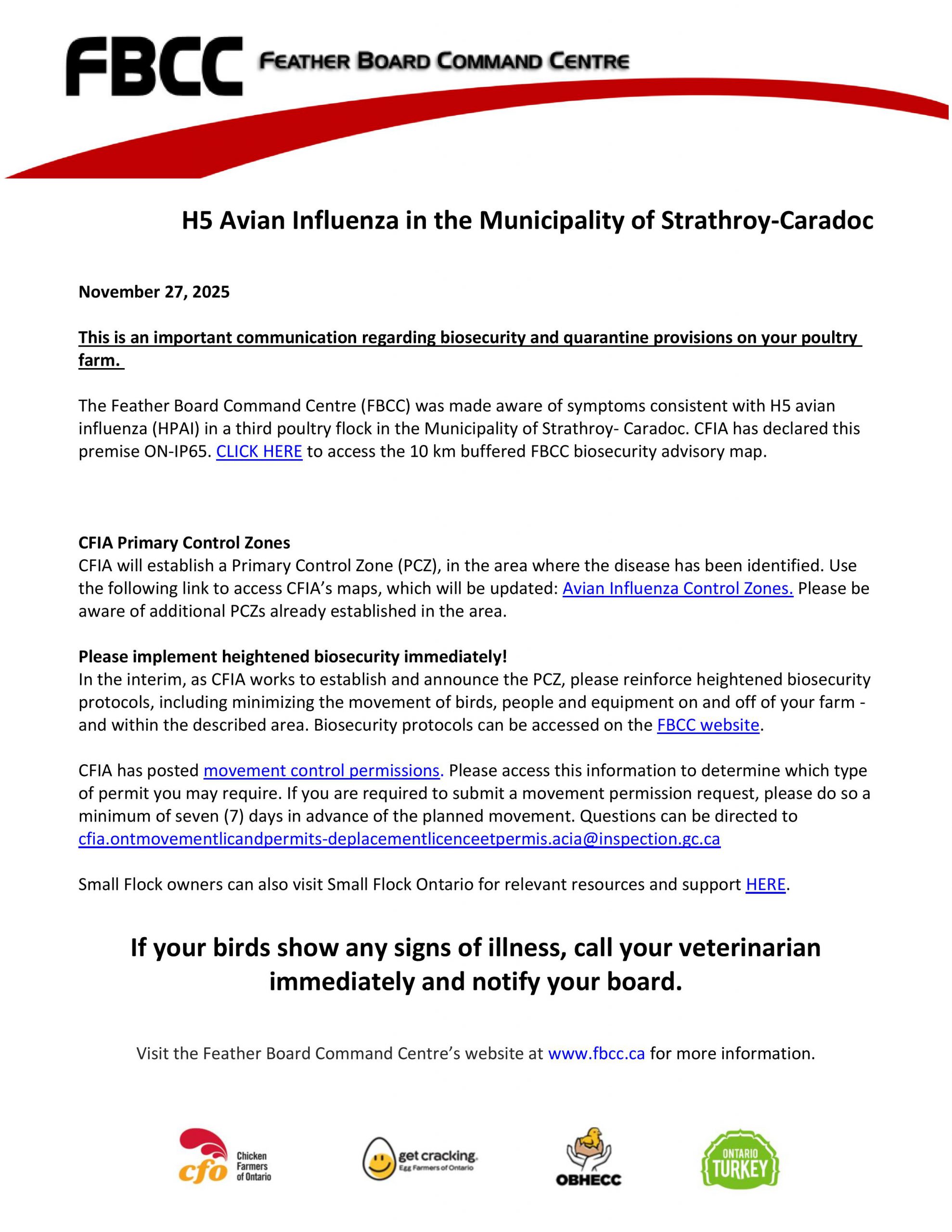 To download a PDF of this release, please click here: H5 Avian Influenza in the Municipality of Strathroy-Caradoc