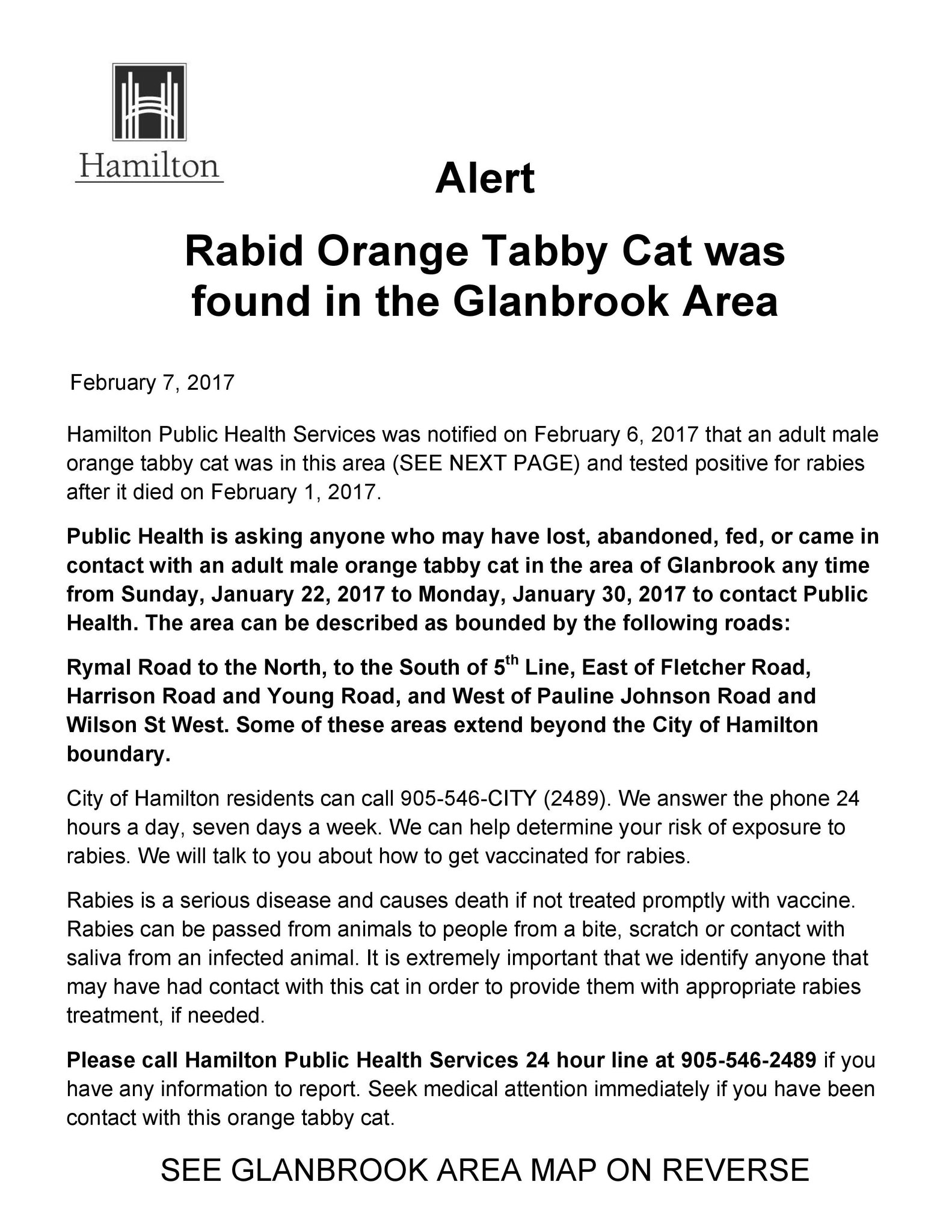 Alert from Hamilton regarding cat with rabies found in Glanbrook Area