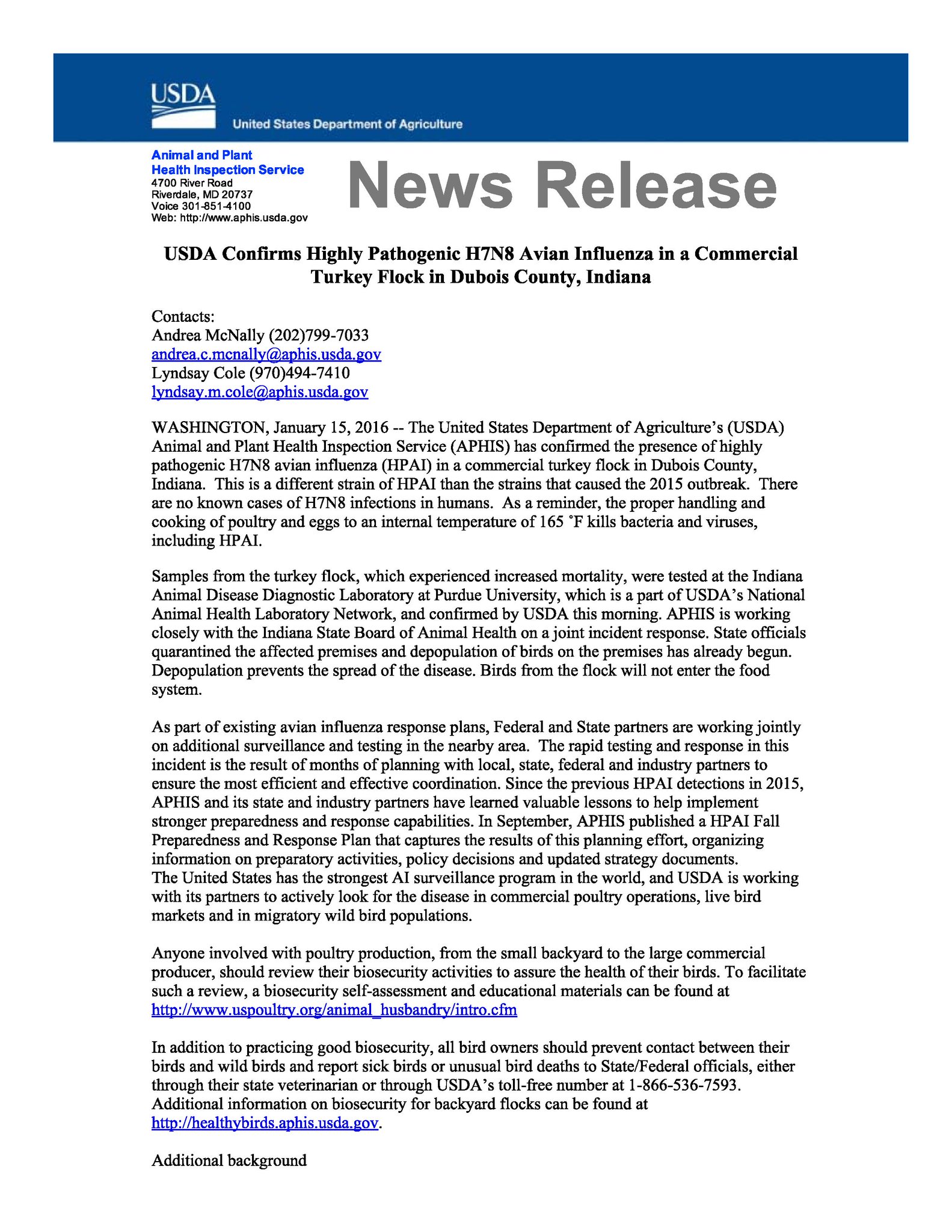 USDA Confirms High Path Avian Influenza in a Commercial Turkey Flock in Indiana