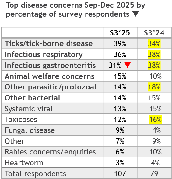 There were 107 survey respondents from 36 counties, including primary care, referral, mobile and emergency practices. Several respondents from different regions reported increased blastomycosis cases in dogs, including multiple fatalities. Ticks and tickborne diseases remained the most common infectious disease concern, with 9% of total respondents reporting a “major” increase in cases compared