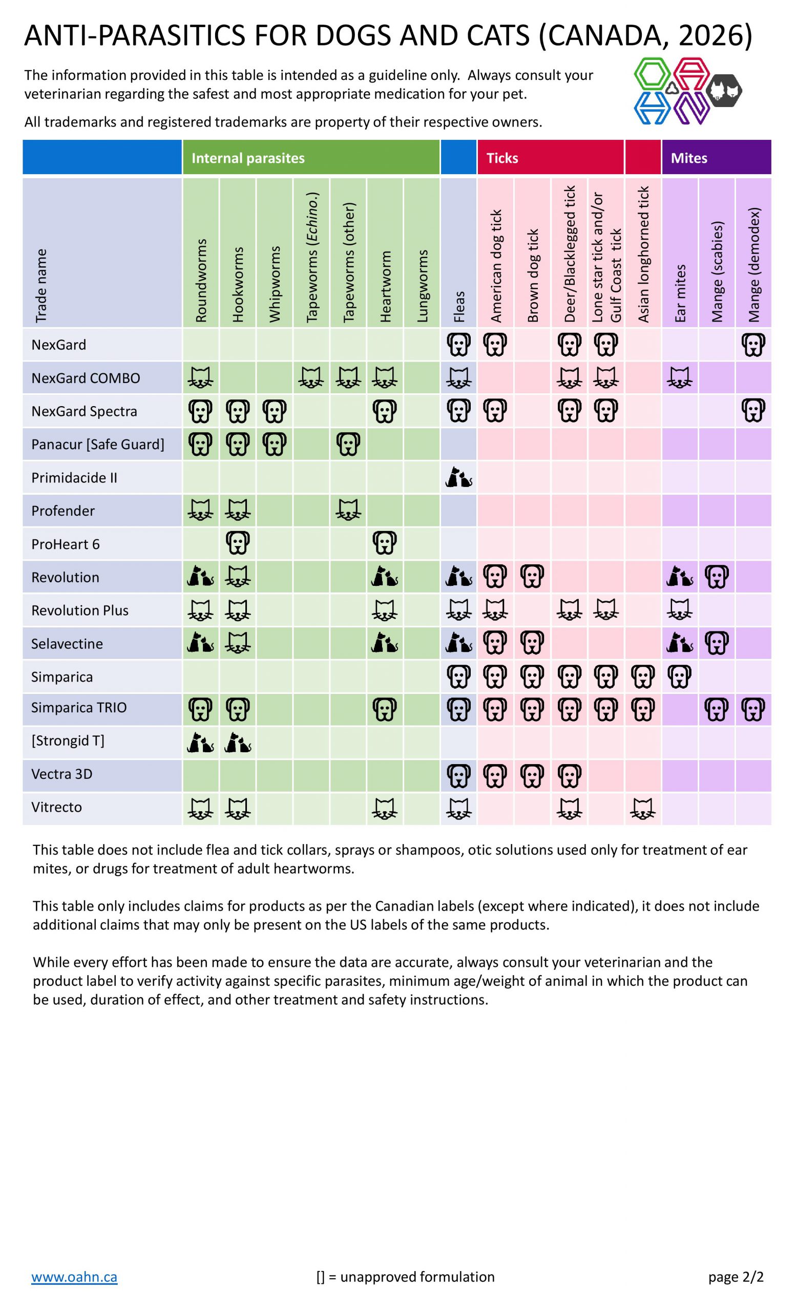 The OAHN Companion Animal Network has created a simplified table for pet owners, and a veterinary version.