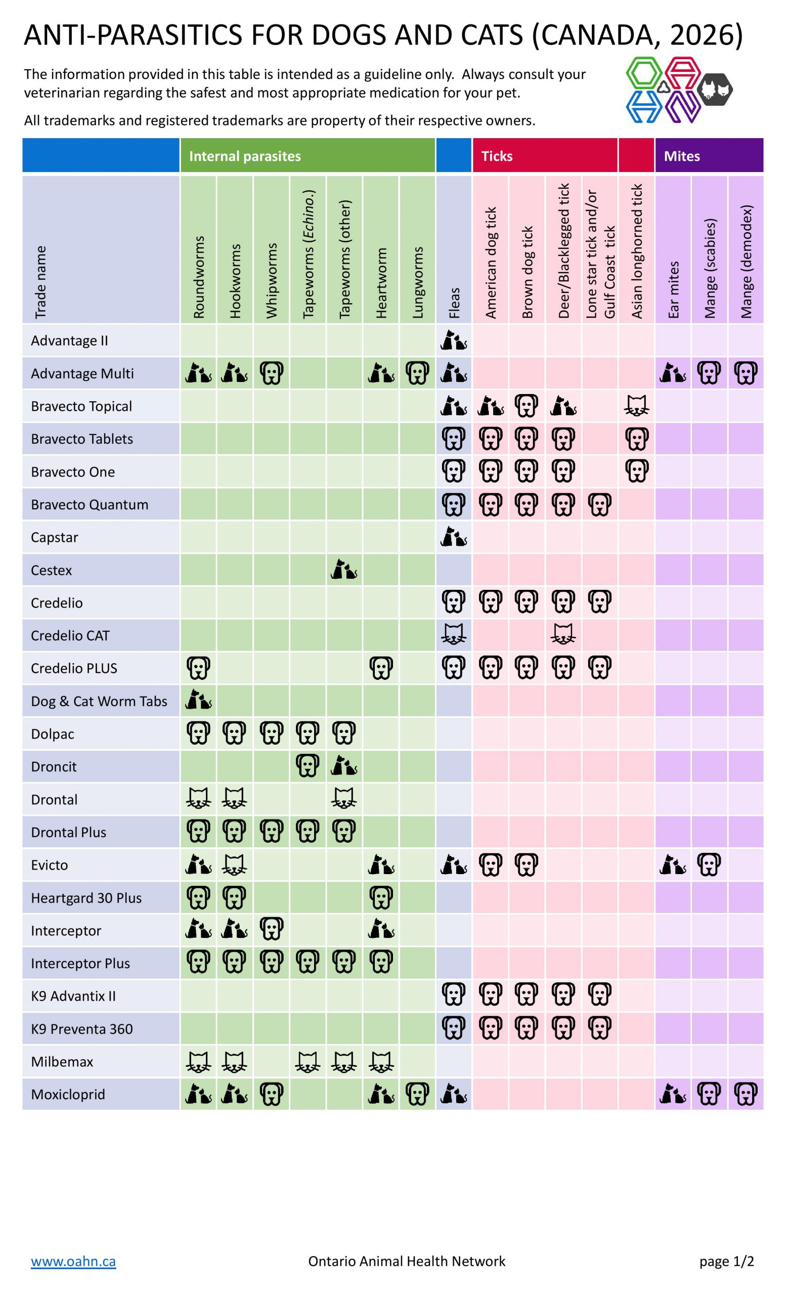 The OAHN Companion Animal Network has created a simplified table for pet owners, and a veterinary version.